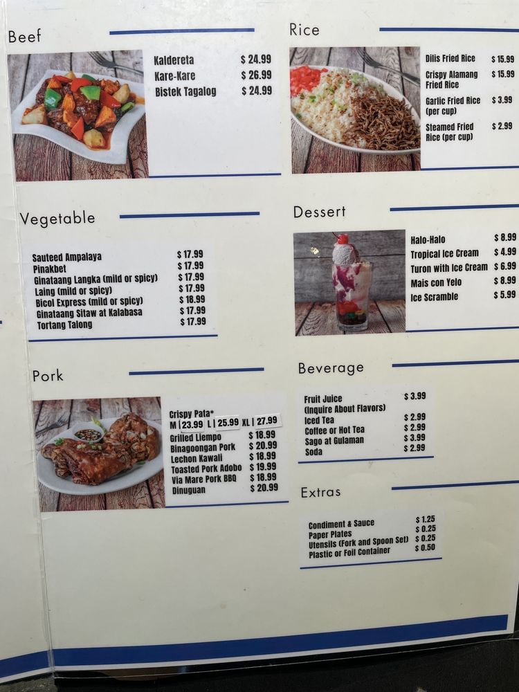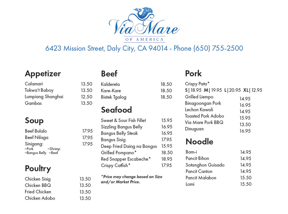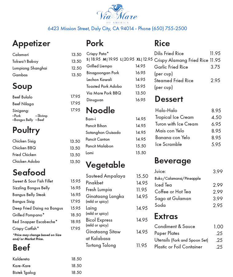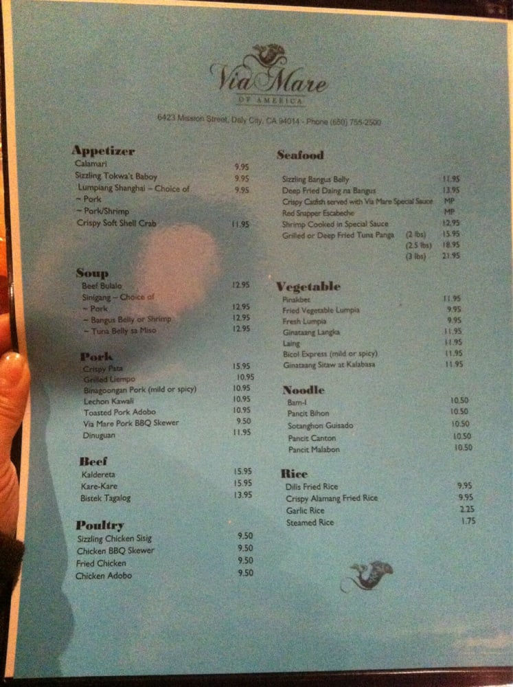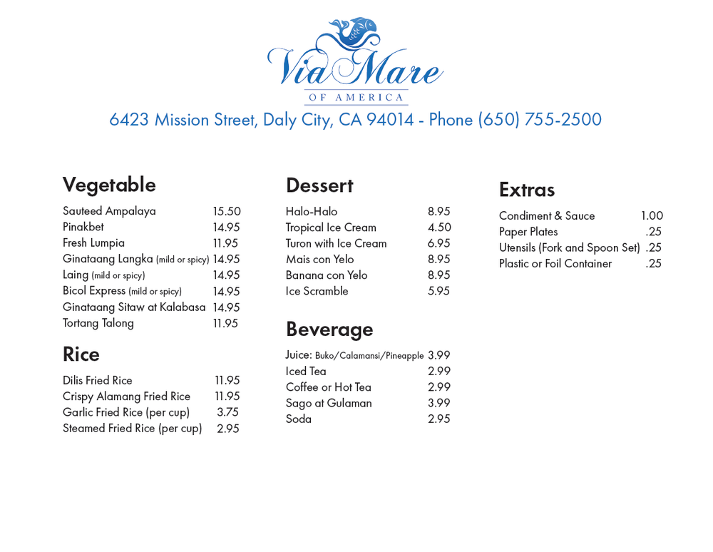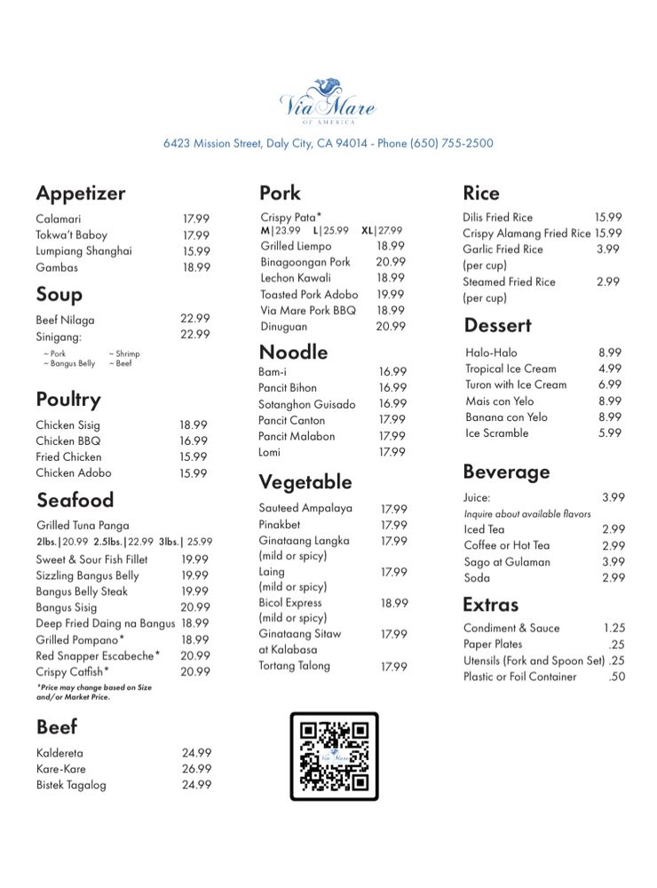 Via Mare Of America is a Filipino restaurant located in Daly City, CA, offering a variety of traditional Filipino dishes. With a casual ambiance and good for groups and kids, Via Mare provides a diverse menu with options for vegetarians as well. The restaurant also offers delivery, takeout, and catering services. Highlights of the menu include Crispy Pata, Beef Nilaga, and Lumpiang Shanghai. Customers praise the delicious food, friendly staff, and the opportunity to introduce non-Filipino friends to Filipino cuisine. The restaurant is a go-to spot for those craving home-cooked Filipino meals. With positive reviews and a loyal customer base, Via Mare Of America is a must-visit for authentic and affordable Filipino dining experience.